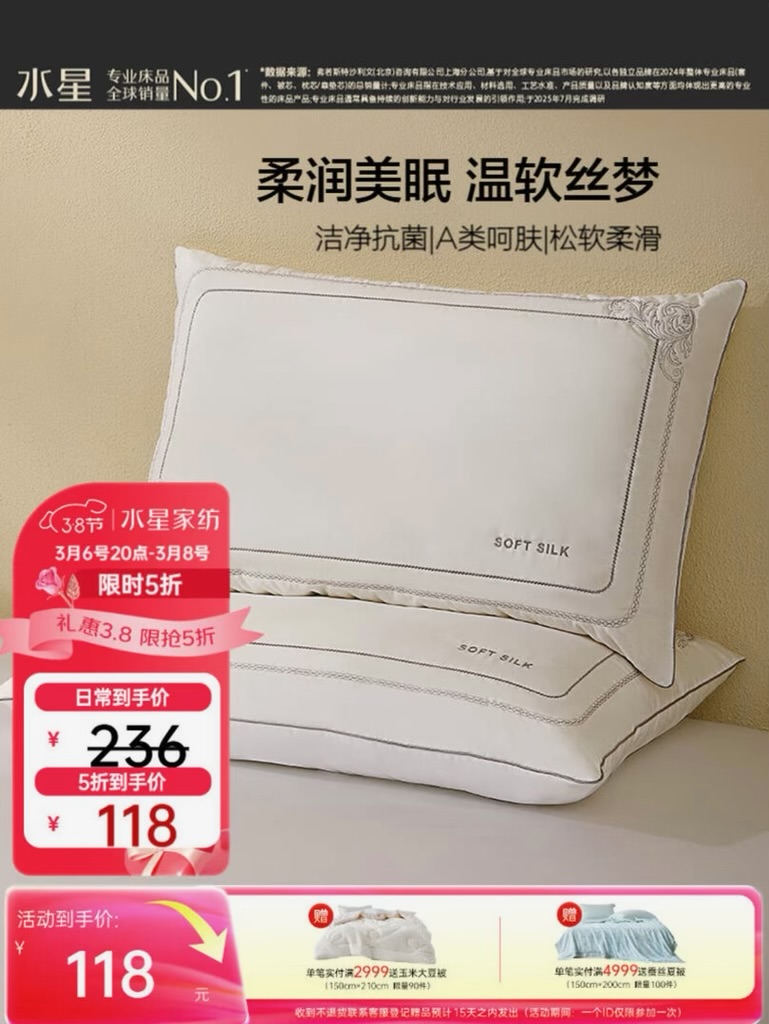 水星家纺蚕丝枕头 A类抑菌护颈椎枕头芯 家用软枕头成人一对装48cm*74cm